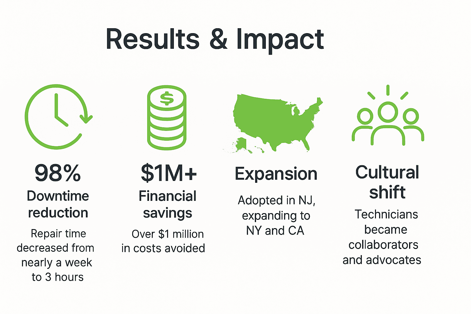 Downtime reduction: Repair response time dropped by over 98%, from nearly a week to three hours.